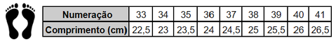 Se tiver dúvidas na numeração, veja a tabela abaixo e procure aquele que encaixa melhor na sua medida em CM (centímetros).
