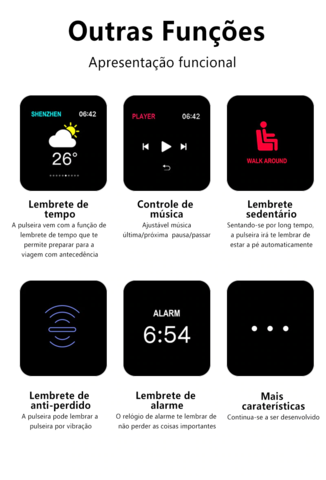3. Outras funções: intelligent anti-lost, controle remoto de fotografia, modo não perturbe, levantar a mão para a tela brilhante, definição do formato de tempo (hora), o reset de fábrica, pressione para rejeitar chamadas recebidas, três interface do relógio seleção, controle de música (suporte a música anterior, próxima música, play/pause), exposição do tempo, para a apple para a saúde, entre outros.
