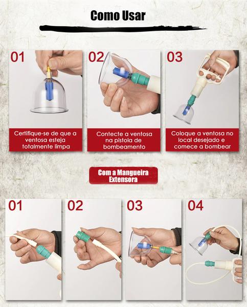 O Kit de Ventosas para Ventosaterapia Chinesa conta com 32 ventosas de acrílico e aplicador para facilitar na aplicação das ventosas sobre a pele para a realização de diversas técnicas.