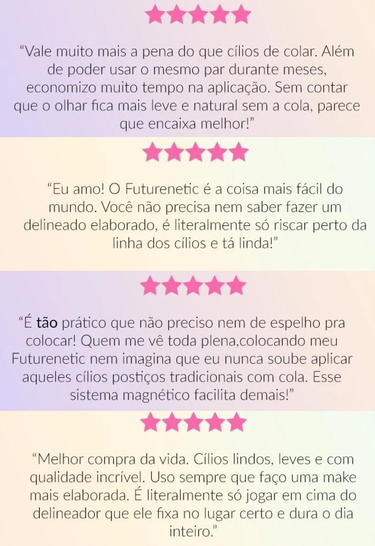 Oferecemos uma variedade de estilos de cílios, com formas e comprimentos variados. Existem 5 mini-ímãs em cada um deles, e você pode cortar o final dos cílios Futurenetic para ajusta-los a qualquer formato e tamanho de olho. Os resultados são incríveis para todos os olhares!