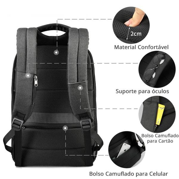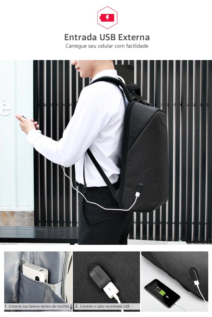 Mochila para Notebooks de até 15.6” com entrada USB para carregamento de dispositivos, utilizando carregadores portáteis (não incluídos), material resistente à água e com design super moderno.