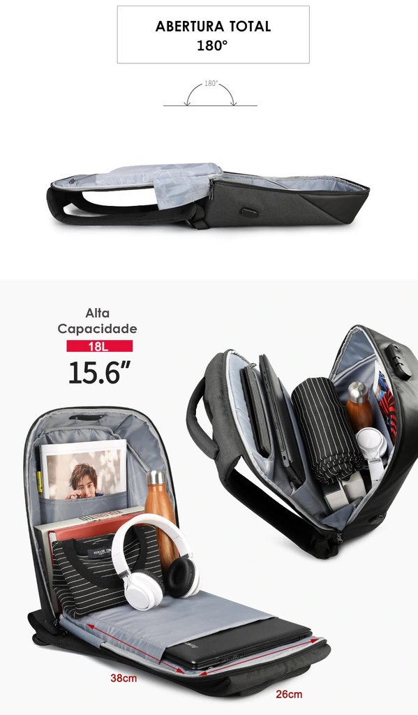 – Pode armazenar Lapto / Notebook de no máximo 15,6″, livros, carteira, tablet, telefone e etc;
