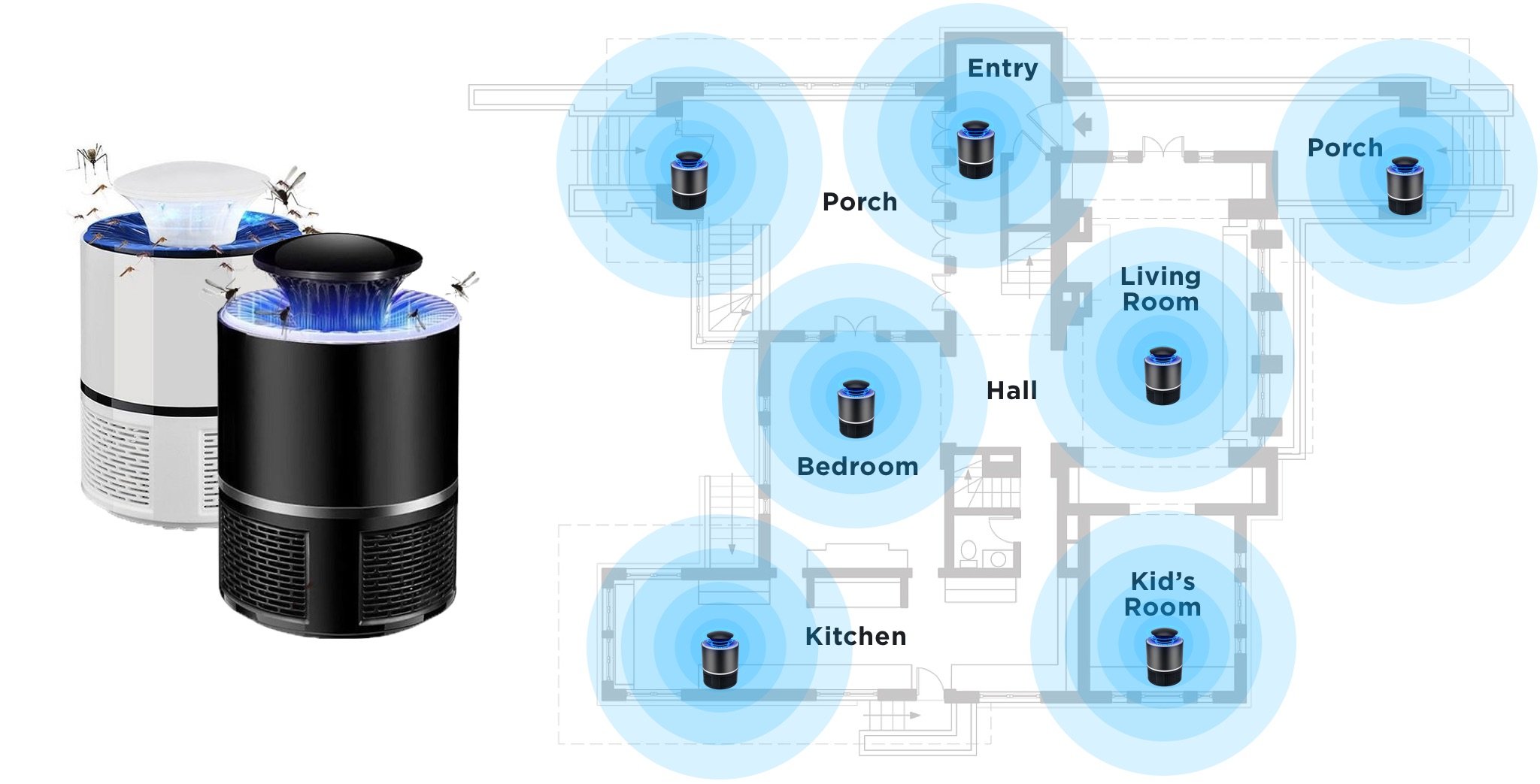 O Violet LED, que é energeticamente eficiente e livre de radiação, libera ondas de luz violeta (365NM a 395NM) para atrair irresistivelmente os mosquitos e prendê-los na câmara anti-fuga segura no interior. Enquanto isso, o ventilador suave imita o fluxo da respiração (um mecanismo de caça natural para mosquitos). Juntos, eles são uma atração irresistível para mosquitos e pragas voadoras.