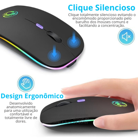 Mouse sem fio recarregável com função de pareamento via wireless e também via bluetooth, o que permite a conexão simultânea em até 2 dispositivos.