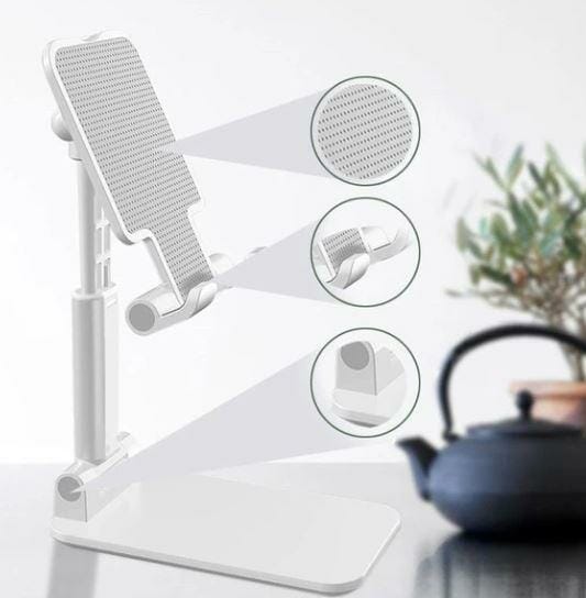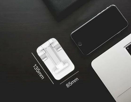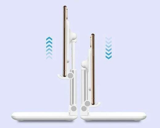 Trata-se de um suporte para telefone e tablet que pode ser dobrado sem montagem, pode ser transportado e possui ajuste de vários ângulos.