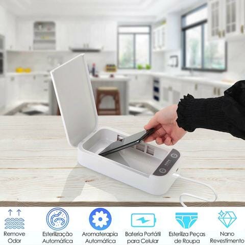 Você poderá higienizar celulares de até 6,5 polegadas, ipod, mp3 players, fones de ouvido, escovas de dentes, relógios, brinquedos, óculos, chaves, jóias e quaisquer outros itens pequenos em qualquer lugar, seja no trabalho, em casa ou no carro.